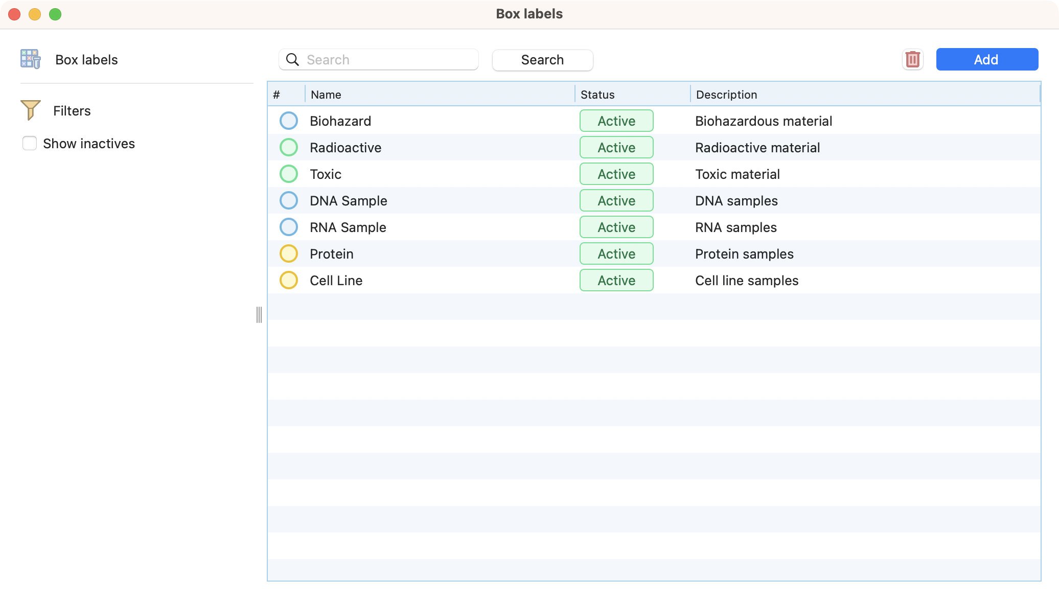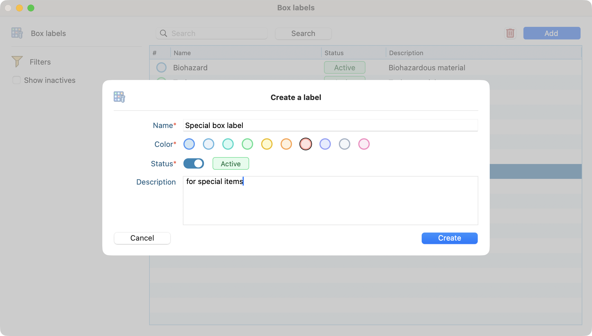 Upon the opening of the module, you can see pre existing box labels related color, name, status and description