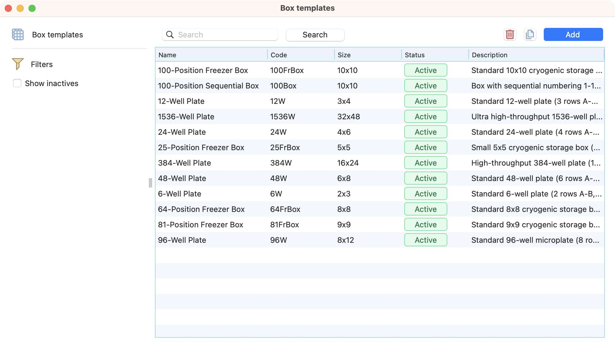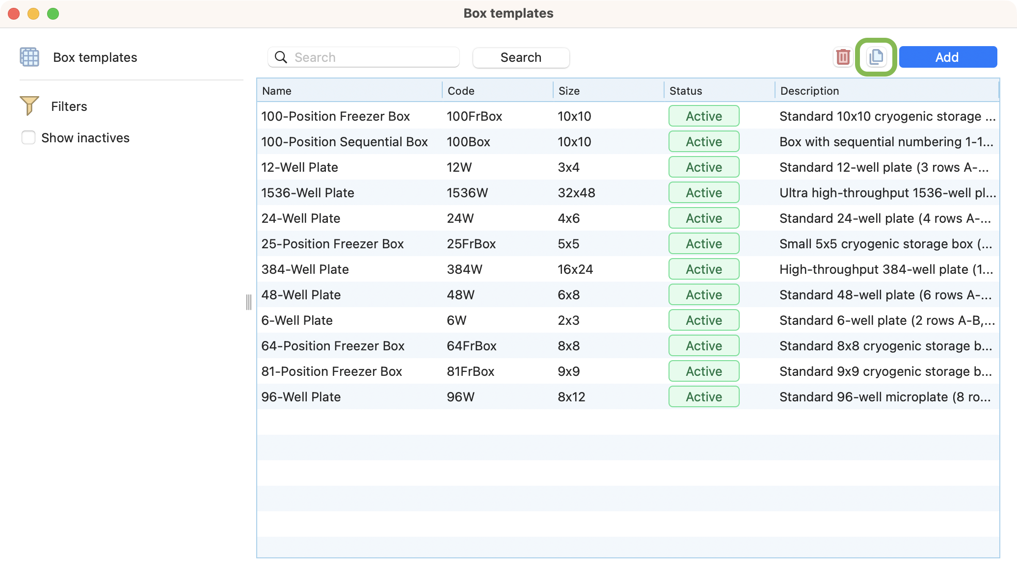 View of box templates browser, with the duplicate button highlighted.¶