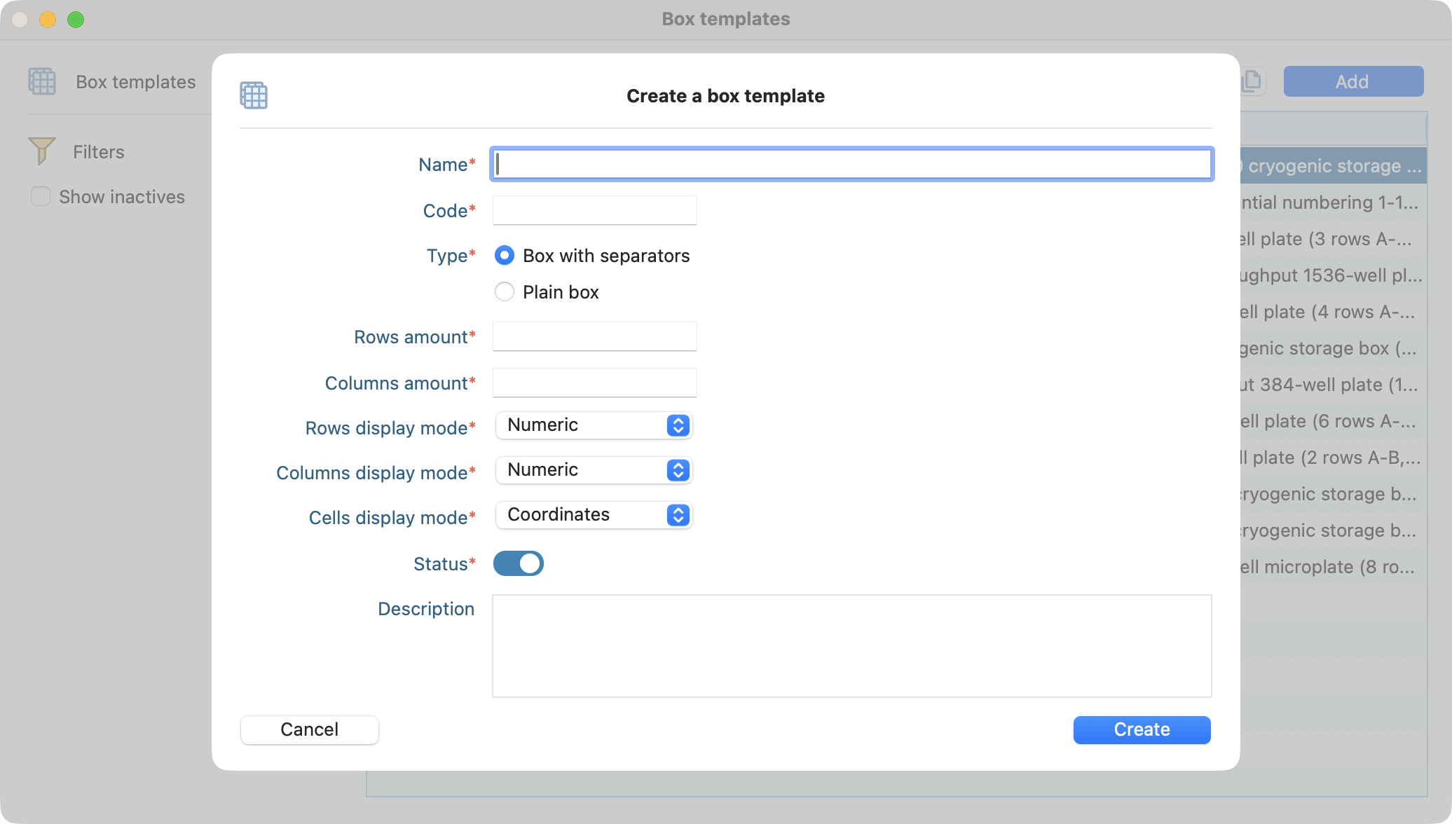 To create a new box template, click the add button, on the top right of the browser. Then fill some information: