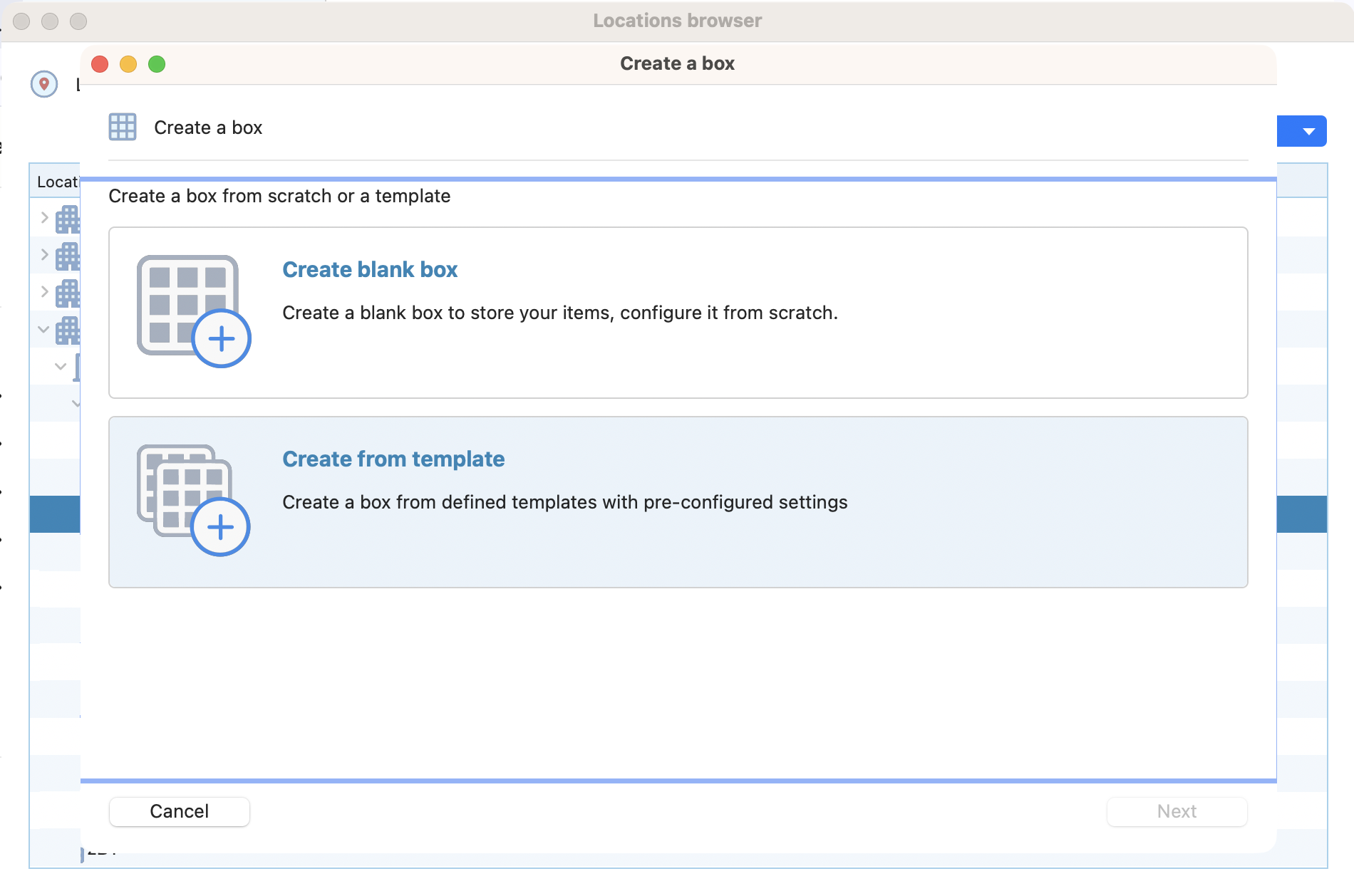 Select between creating a blank box (custom) or a template (recommanded) Box templates.