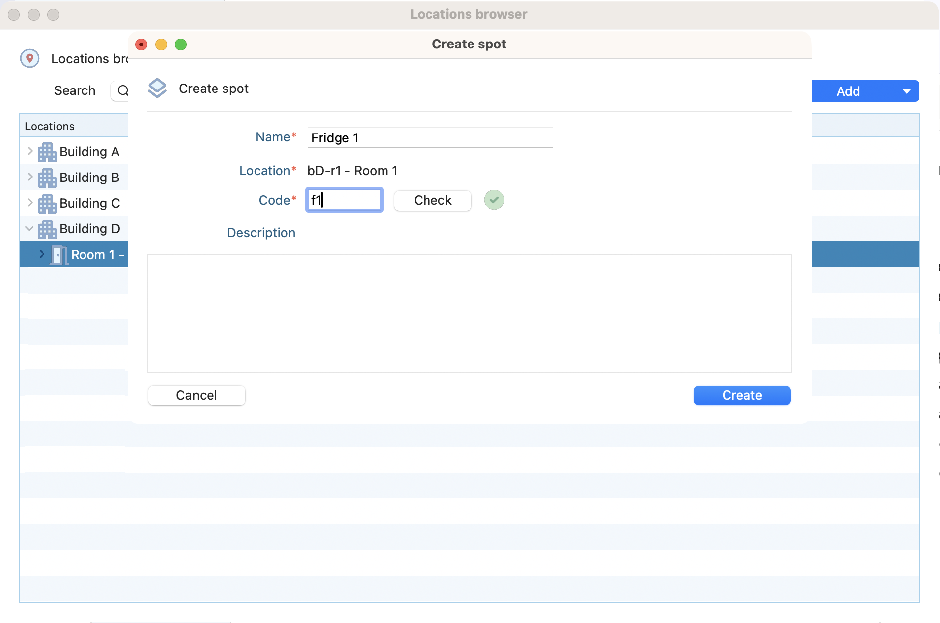 Click on the add button from the selection of a spot. - Define a name and a code (unique per spot).