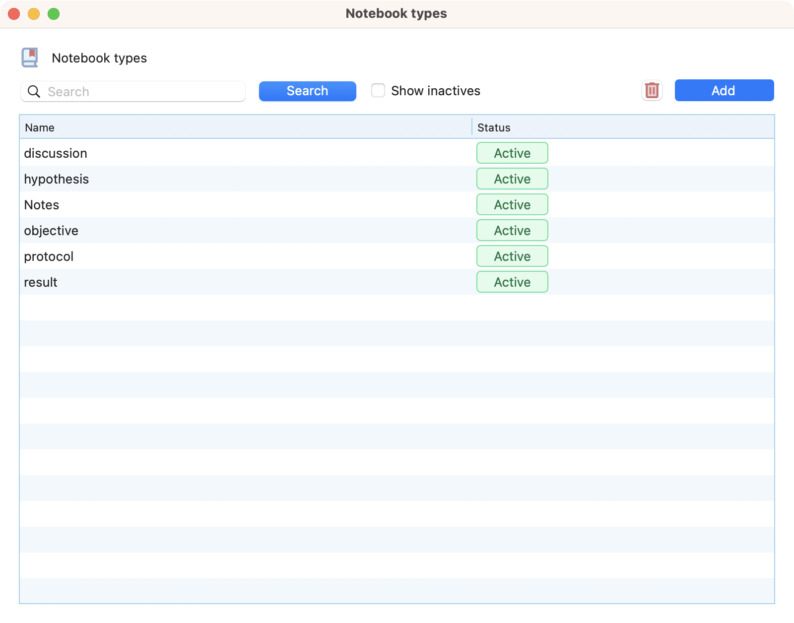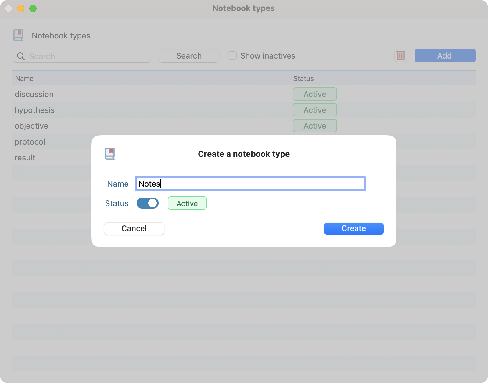 Simply double click on an already created notebook type to edit it. You can edit the name, description and status.