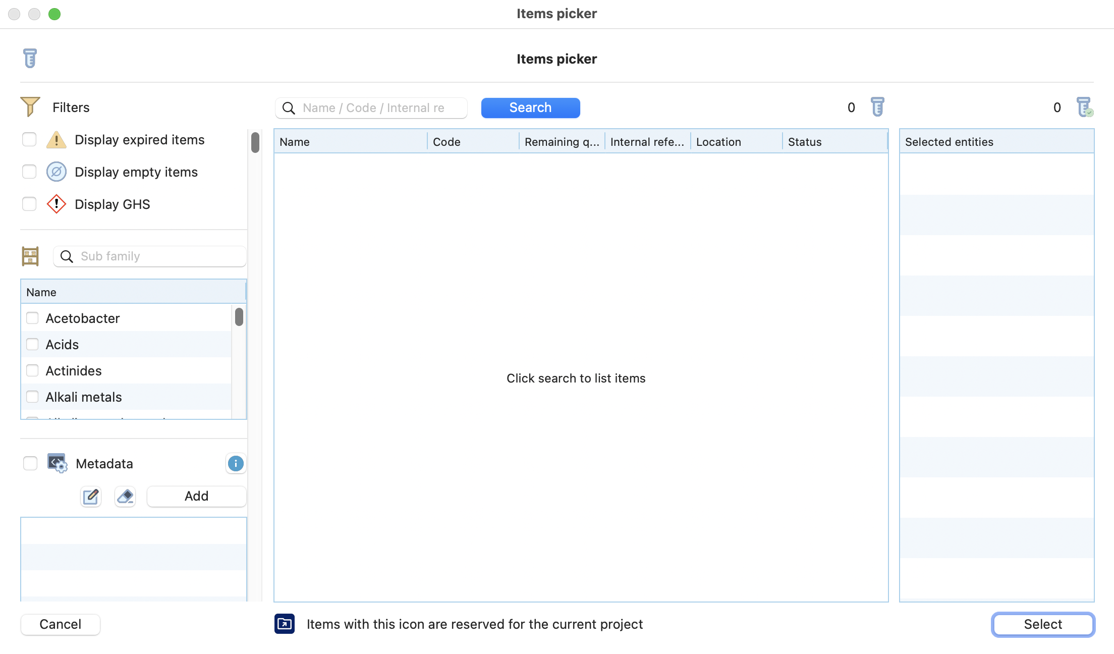 If you click on the Add button, a new window will open to select manually the items you want to add.