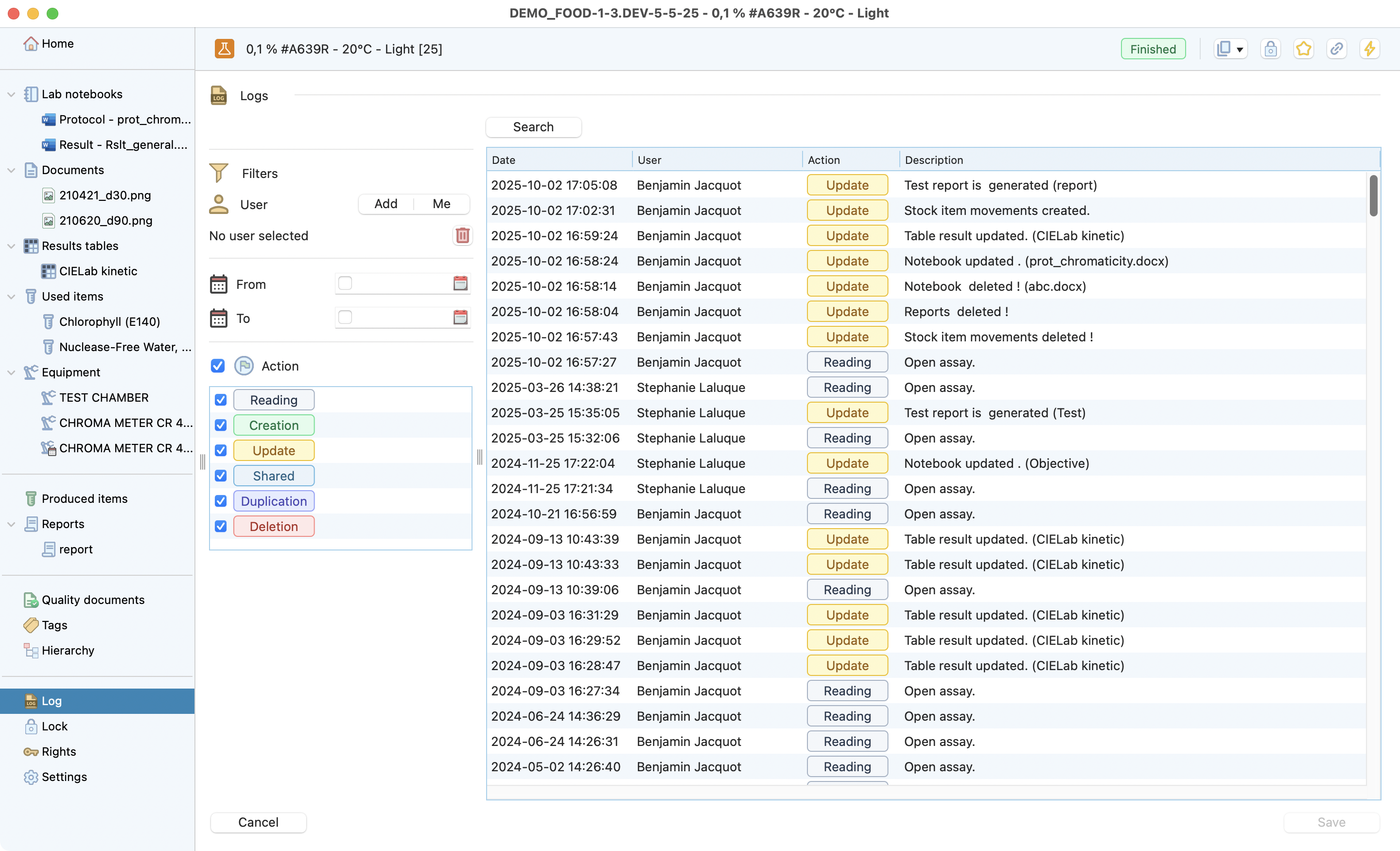 Here you can have full traceability and check all the modifications and the person who performed it. It is possible to search on your test modifications by using filters: