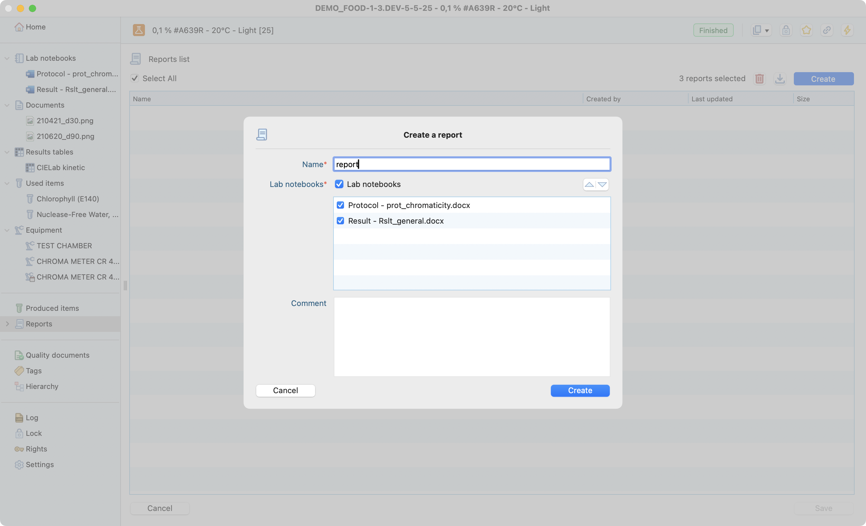 To generate a report to your test, you just need to click on the create button then define the reports name and select the lab notes you want to include.