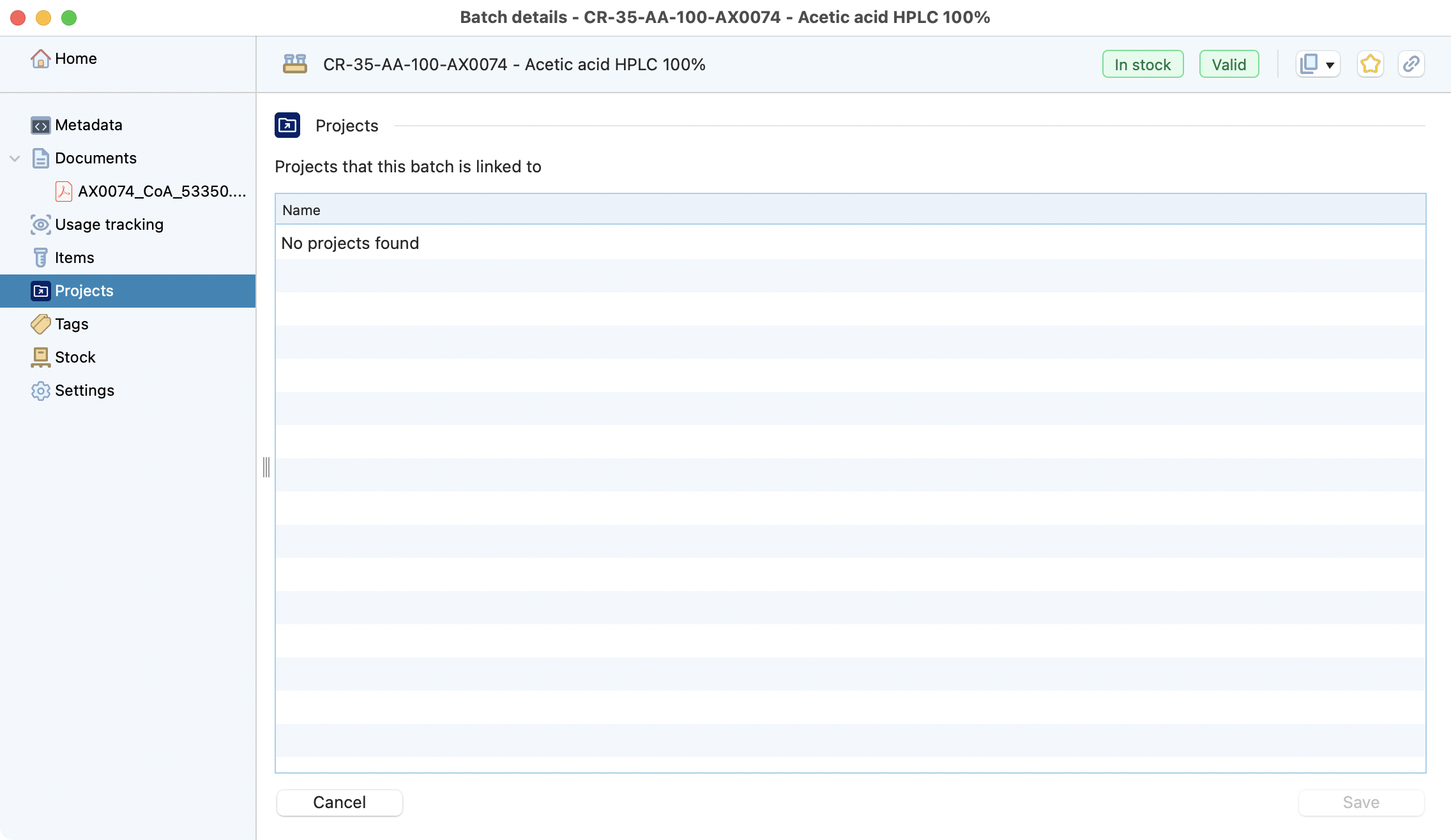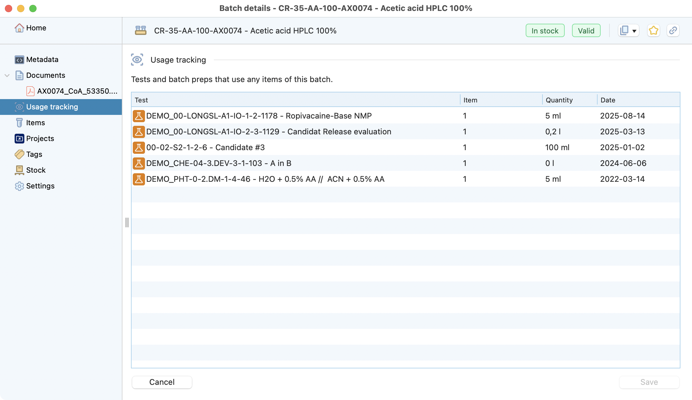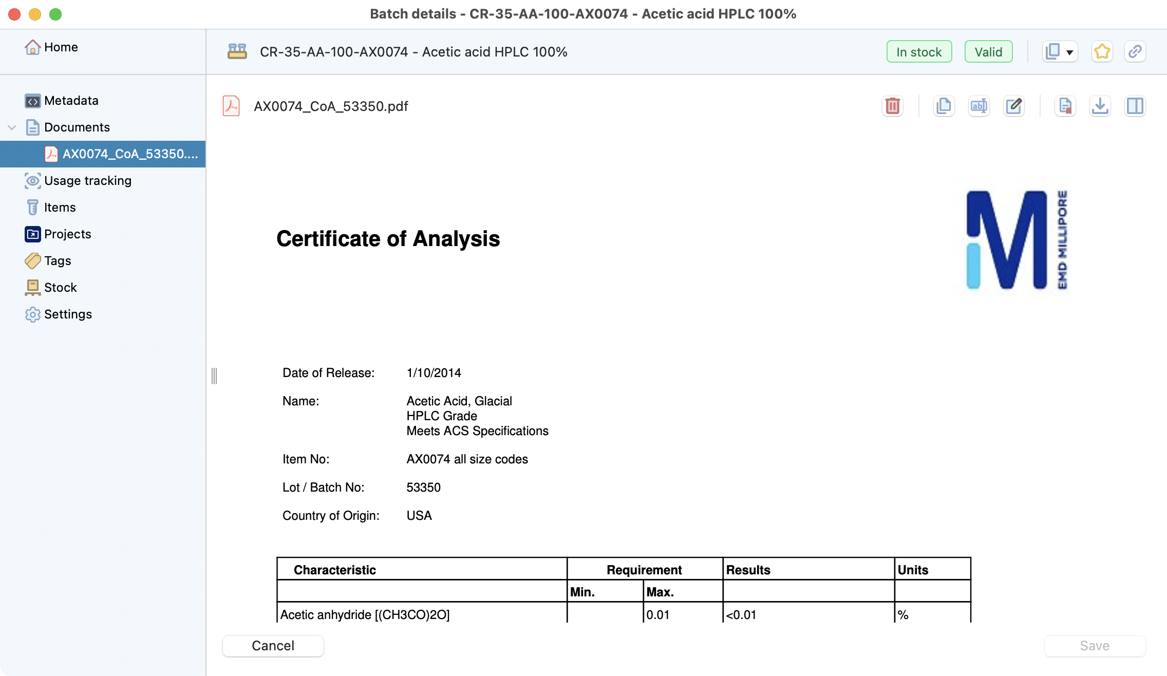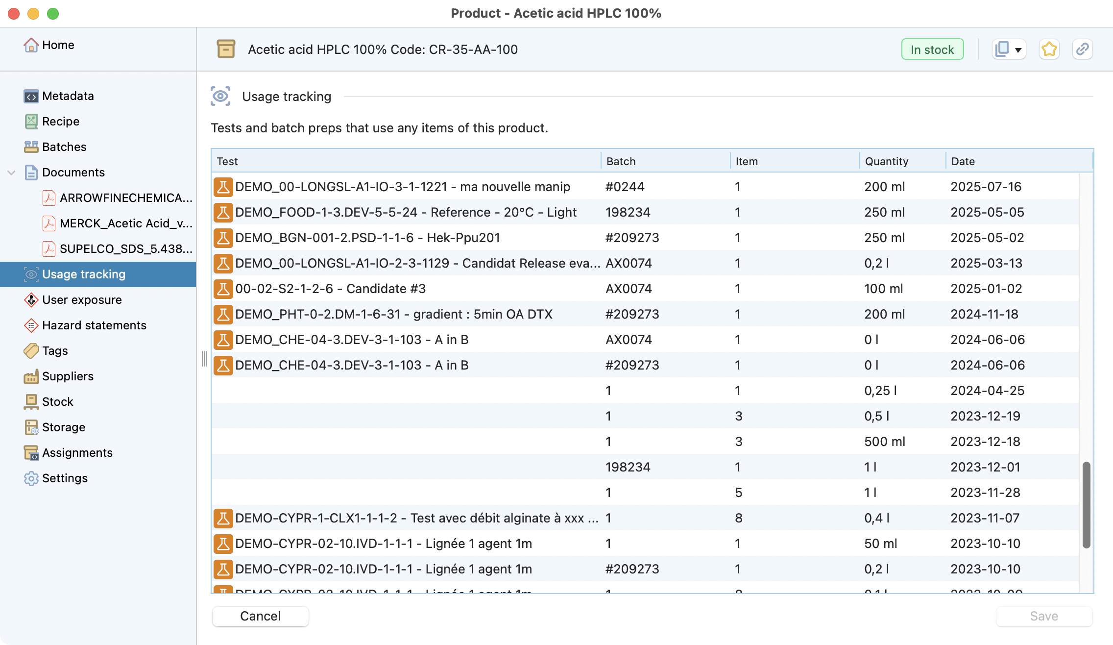 Keep track of the most important products used in your experiment. Store your batch-related info, like production date and Certificate of Analysis. Identify all linked items in a second.