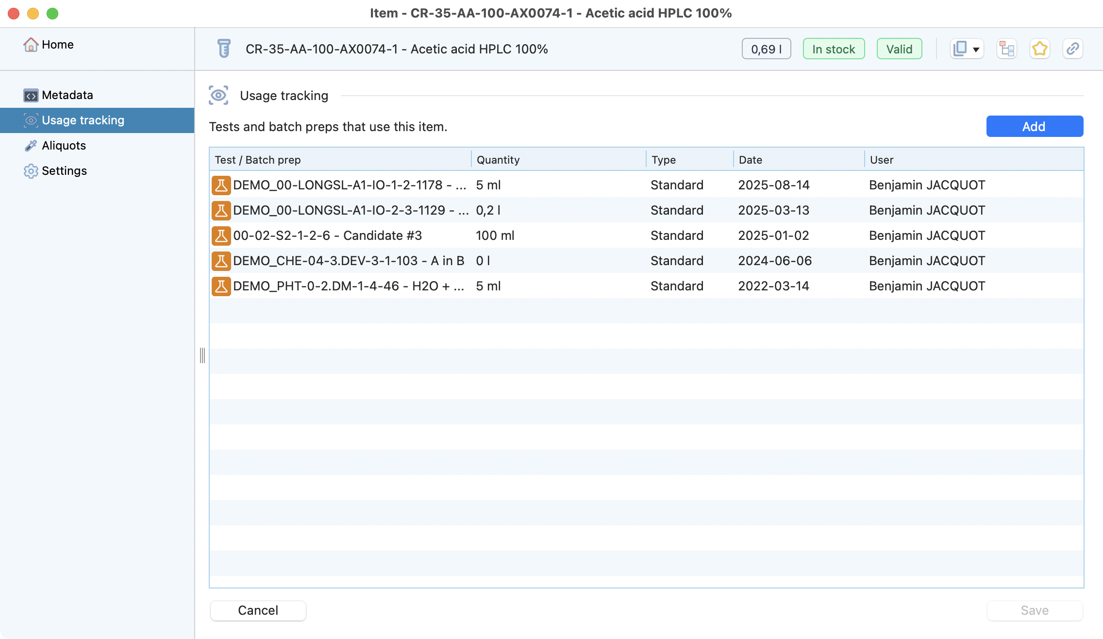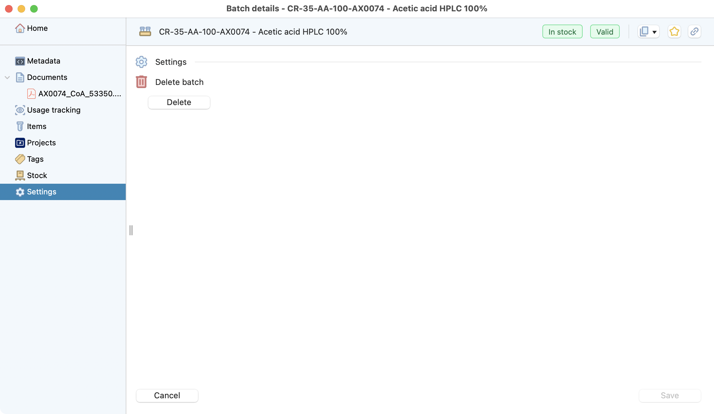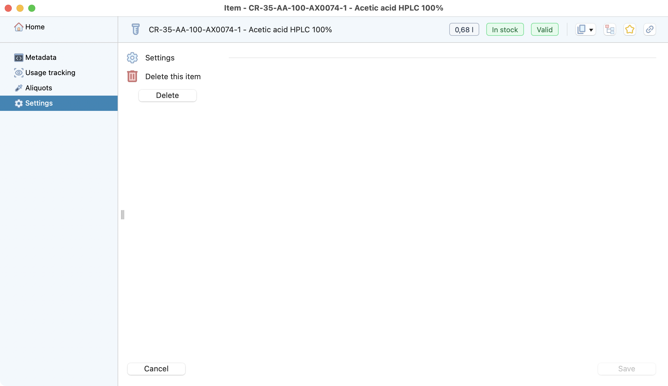 Settings : to delete the item (only if no aliquot(s) or usages are linked to it).
