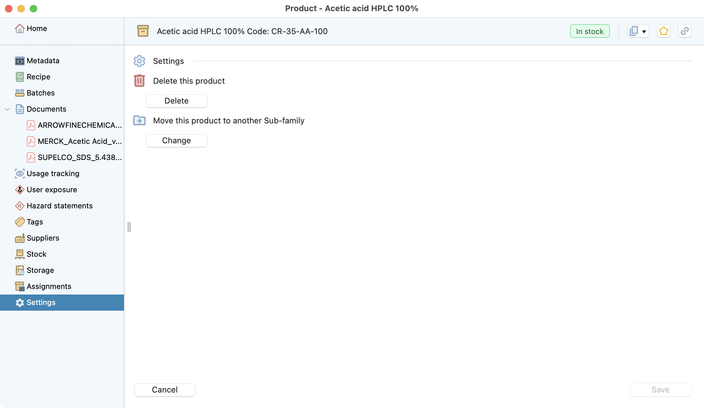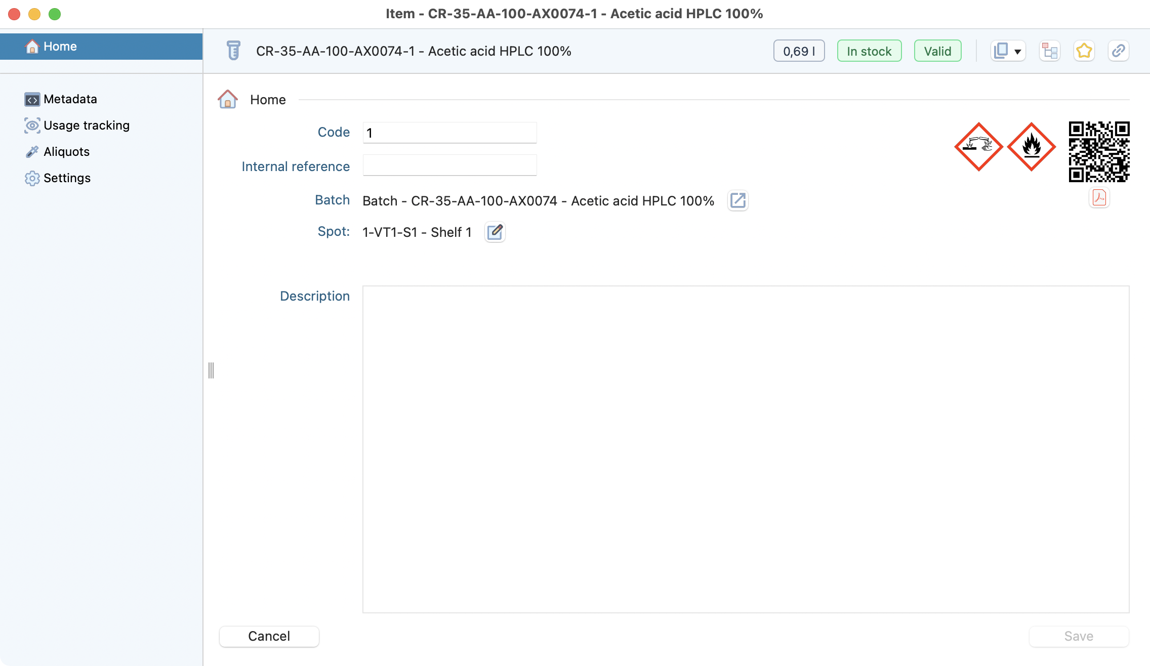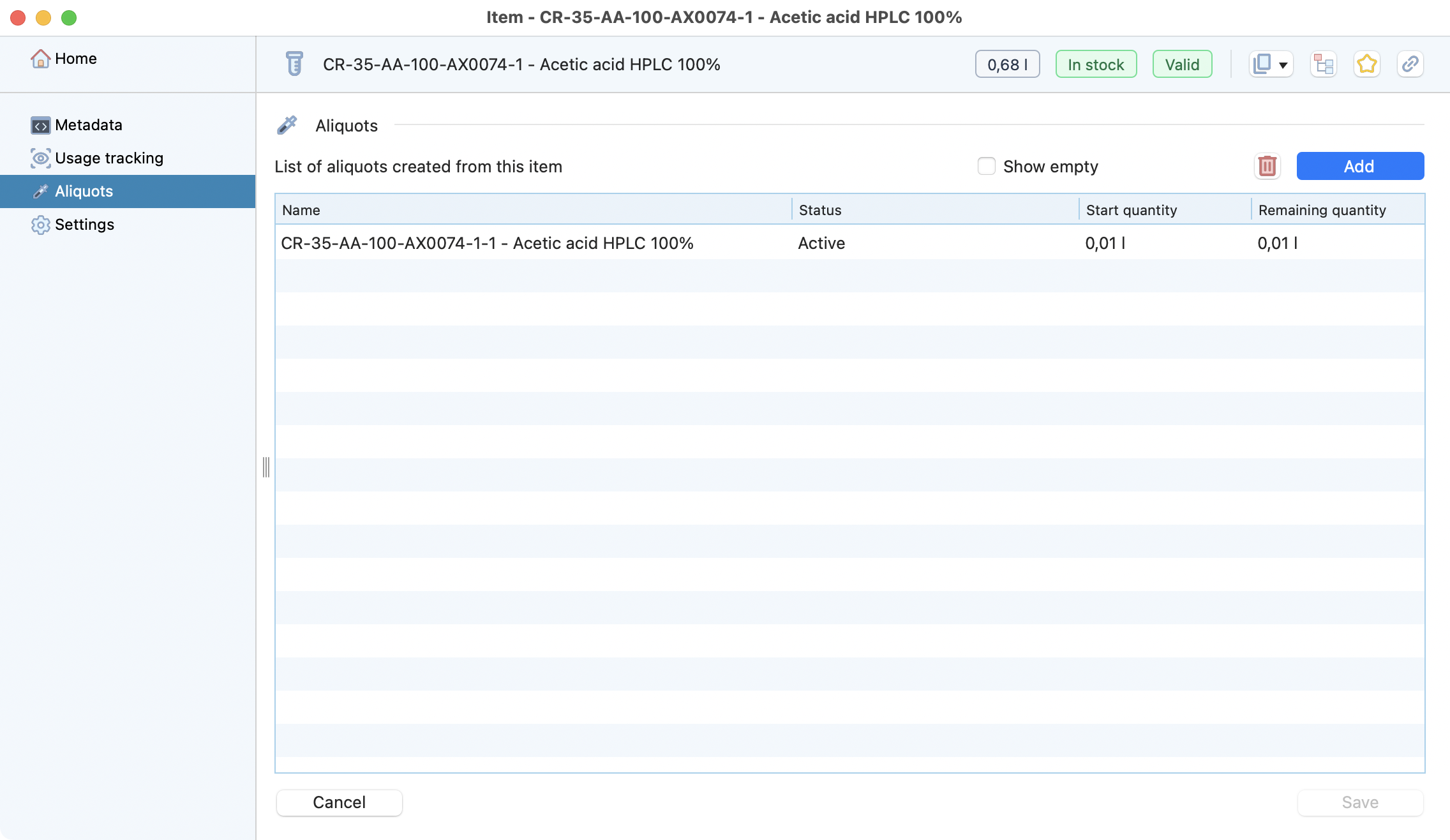 Settings : to delete the item (only if no aliquot(s) or usages are linked to it).