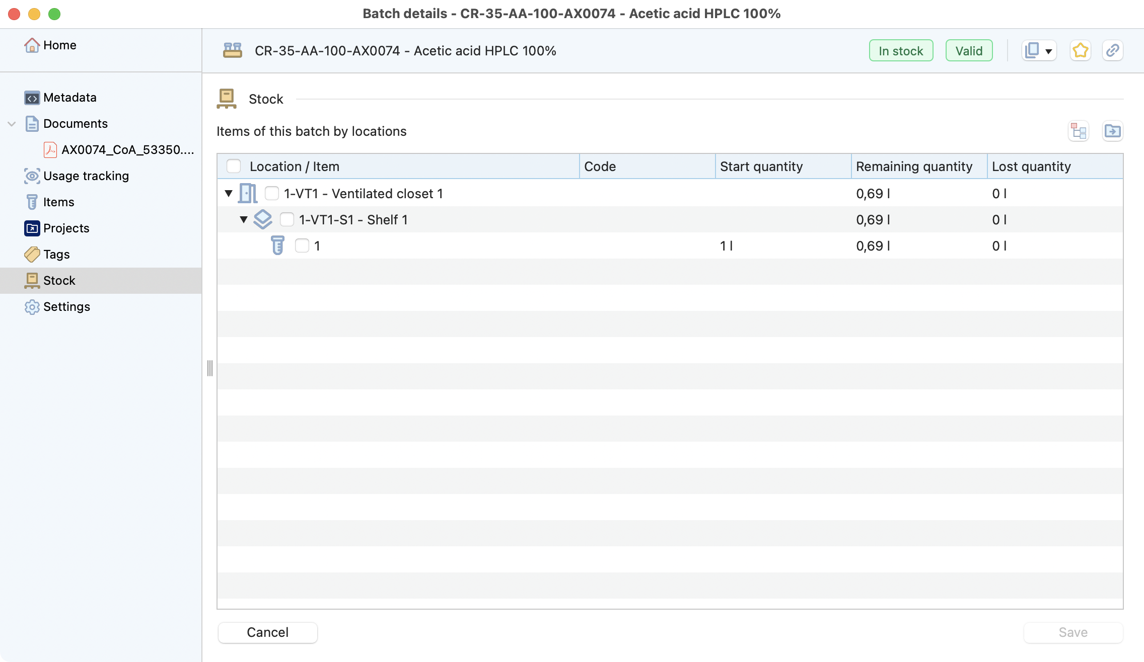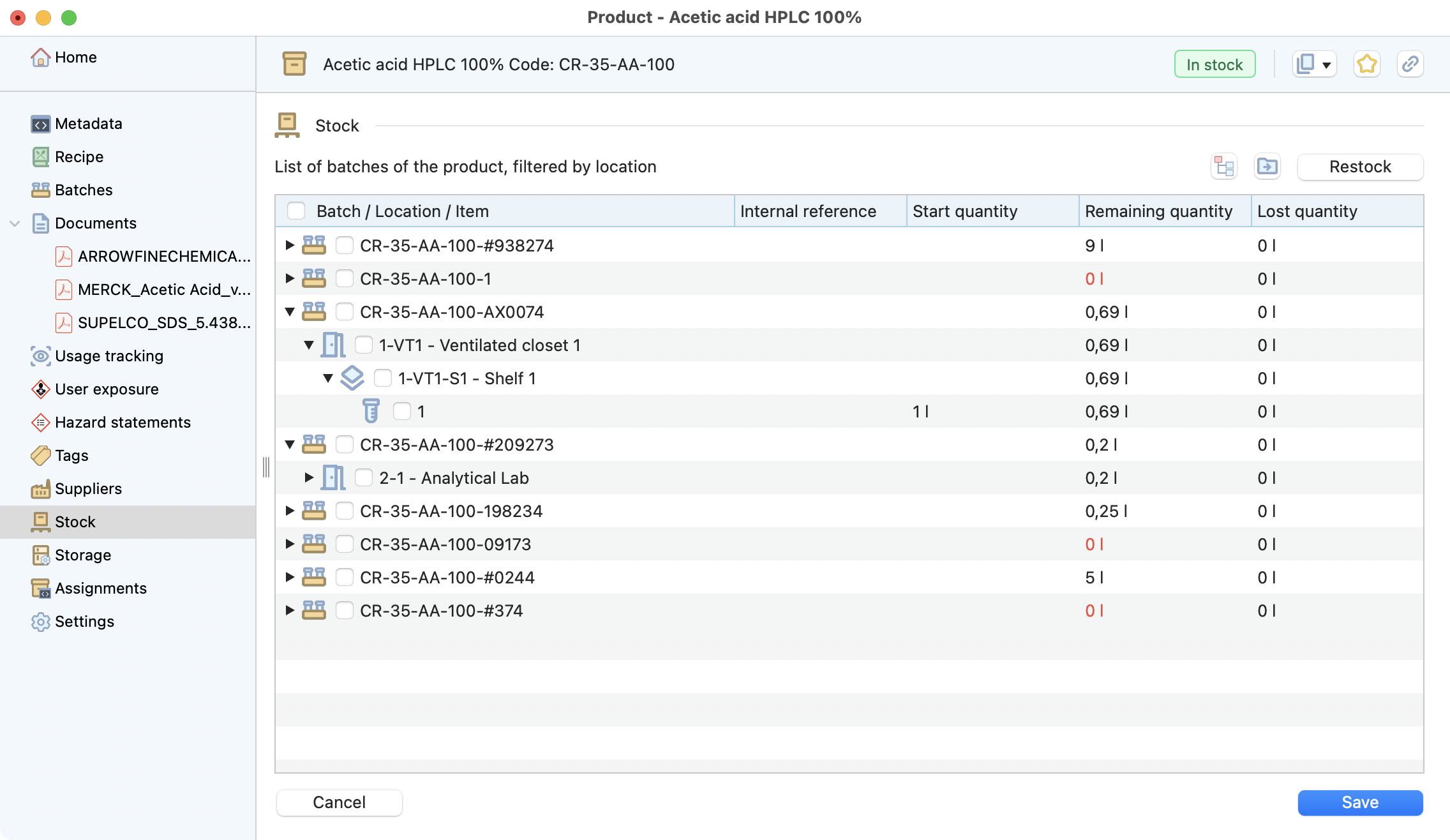 Overview of the remaining quantities for this product, specified by batches and items.¶