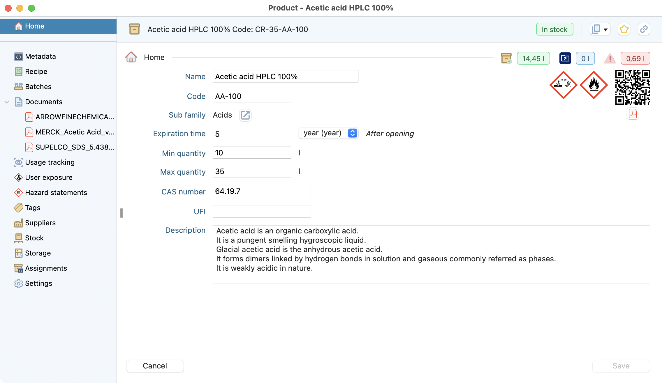 Homepage including general information with name, code, internal code, status, quantities : available / expired / reserved, min and max desired quantities, etc.¶