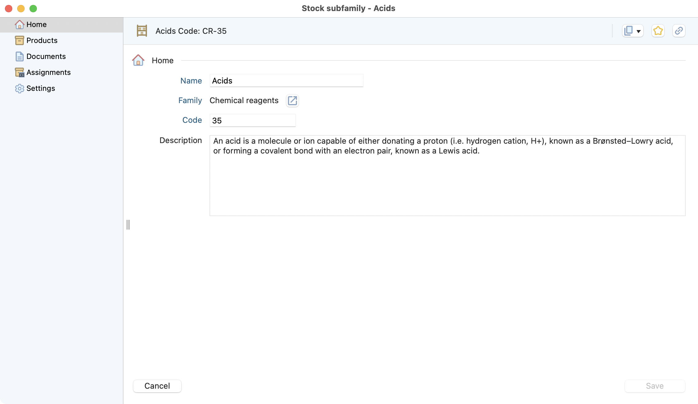 The stock sub-family provide a second level of structuration. Similar to the family, you can add documents relevant to the subject and the code is composed of alpha-numerical characters.