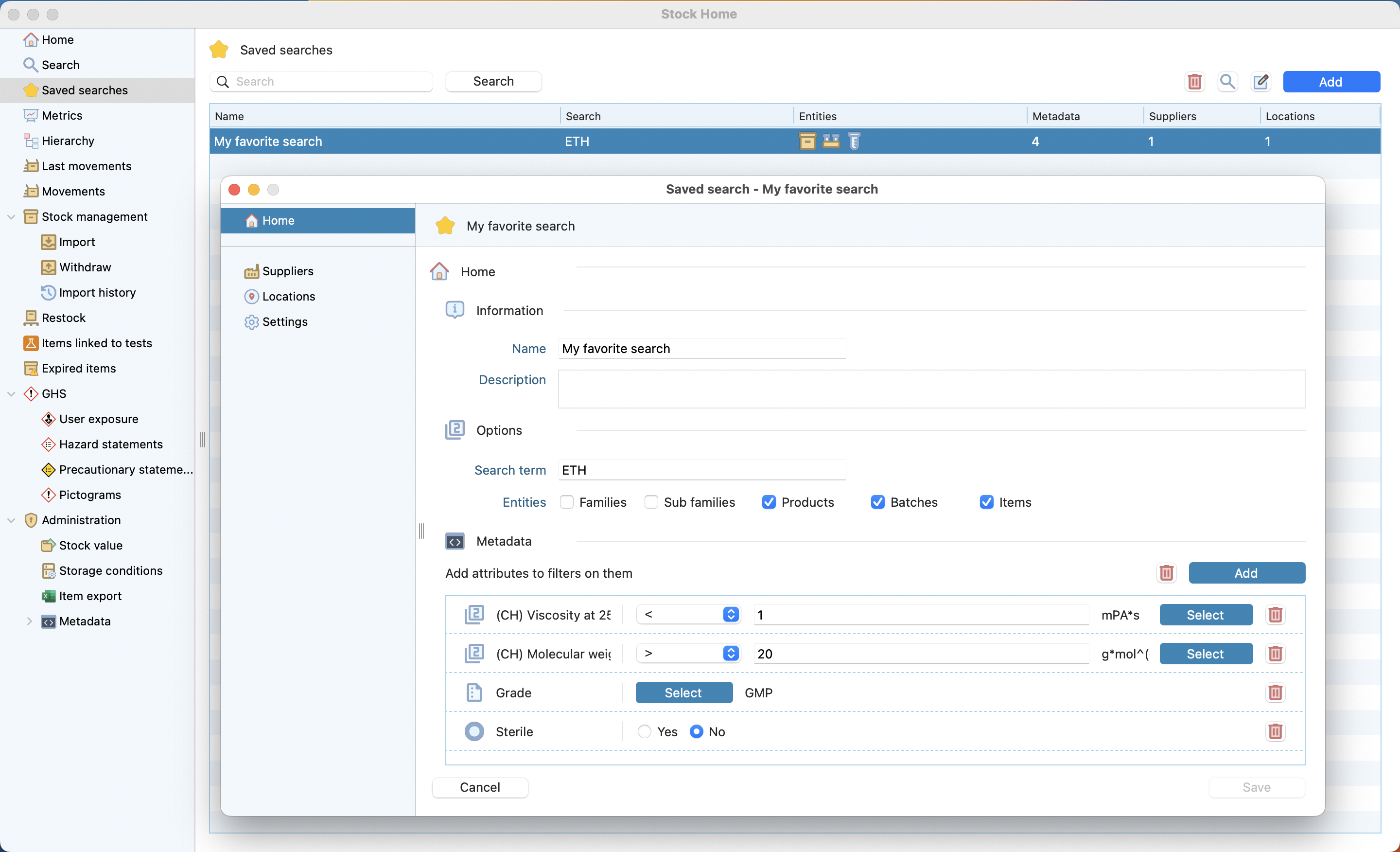 Search results limited to both entity type, metadata (grade = GMP) and text on the search bar.¶