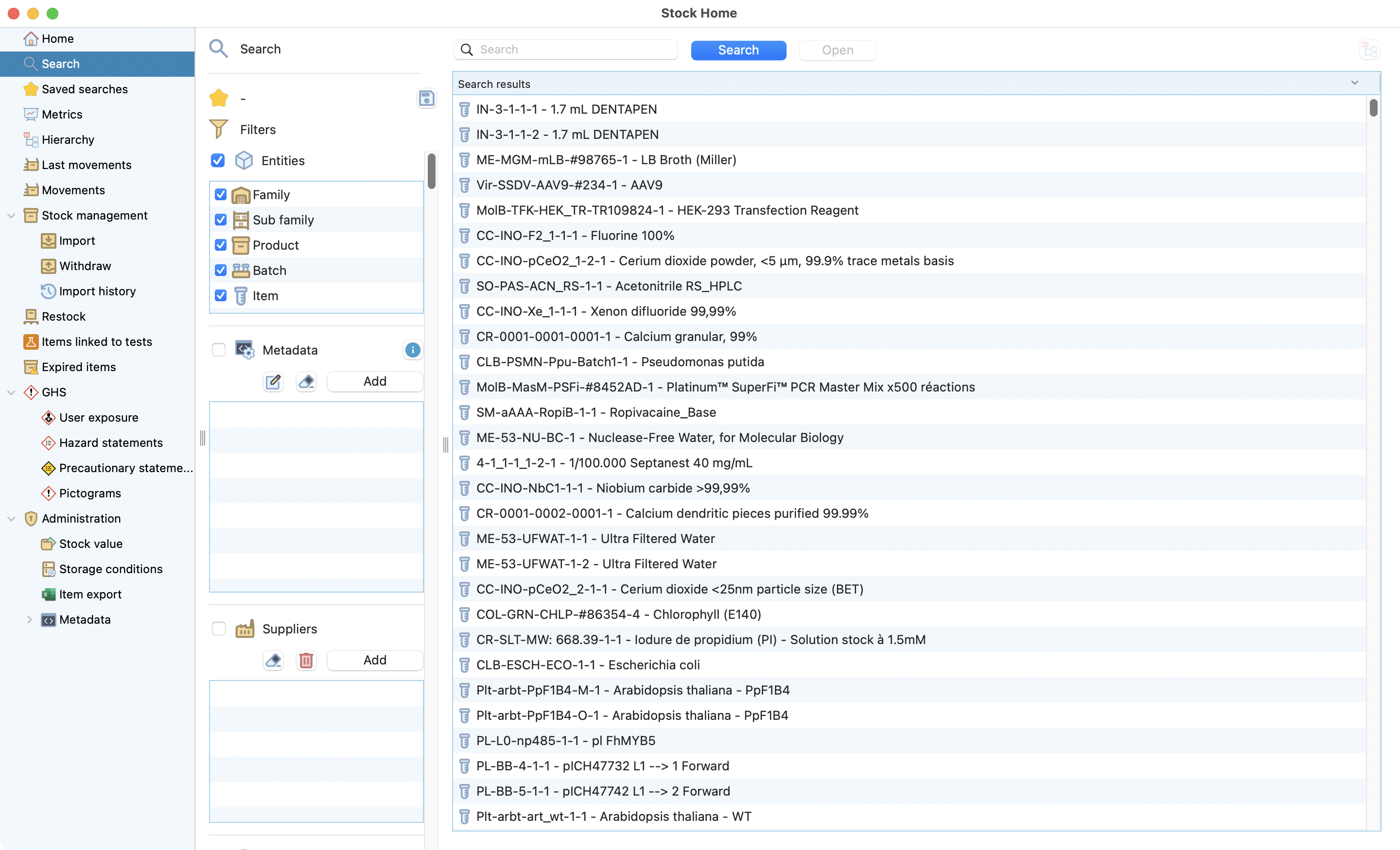 This function quickly lists all stock entities. Click “Display all” to see the full list. It includes various data to quickly find your samples of interest (click here for more details).