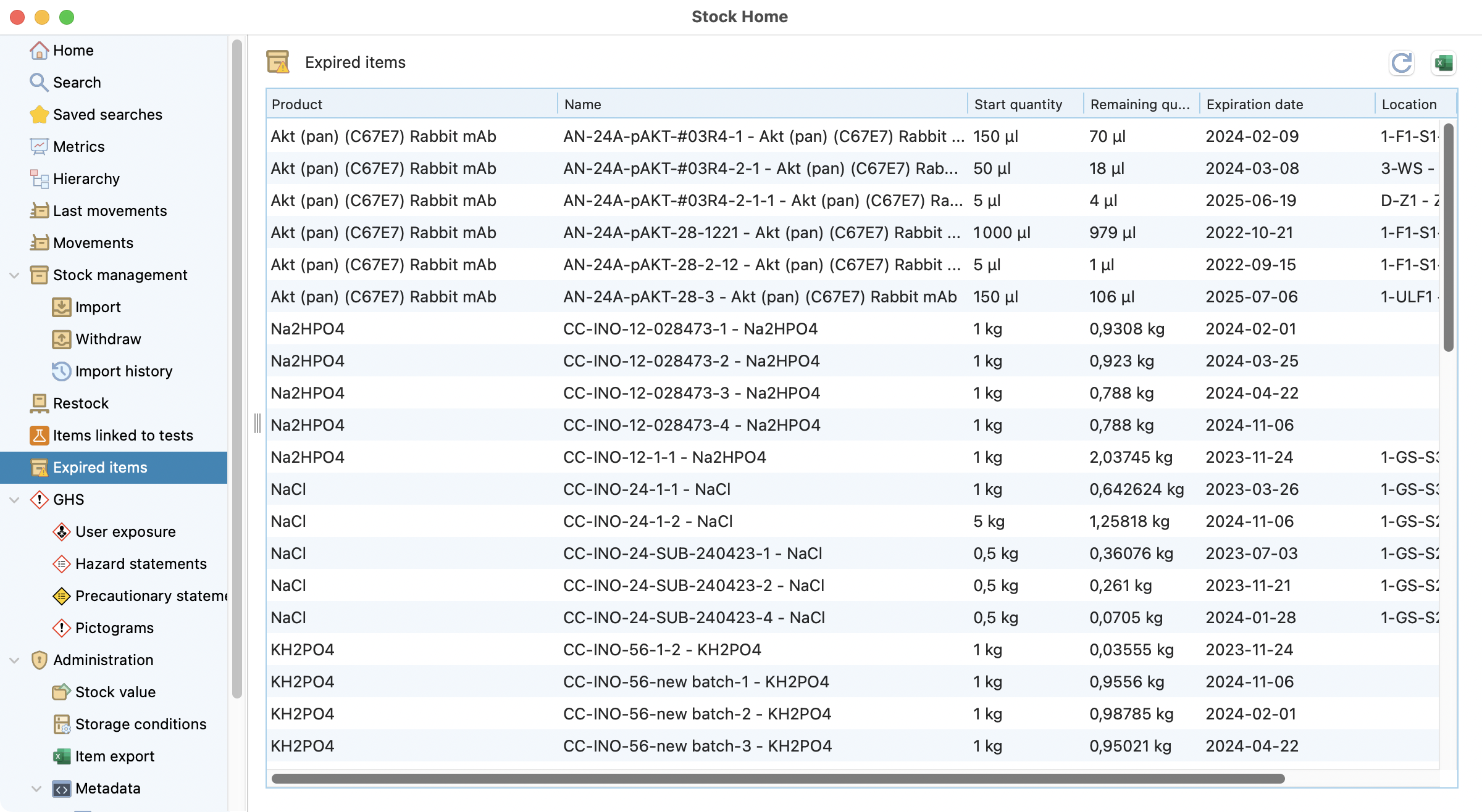 Displays all items that have expired. Either the batch expiration date or the item expiration after opening has been reached.
