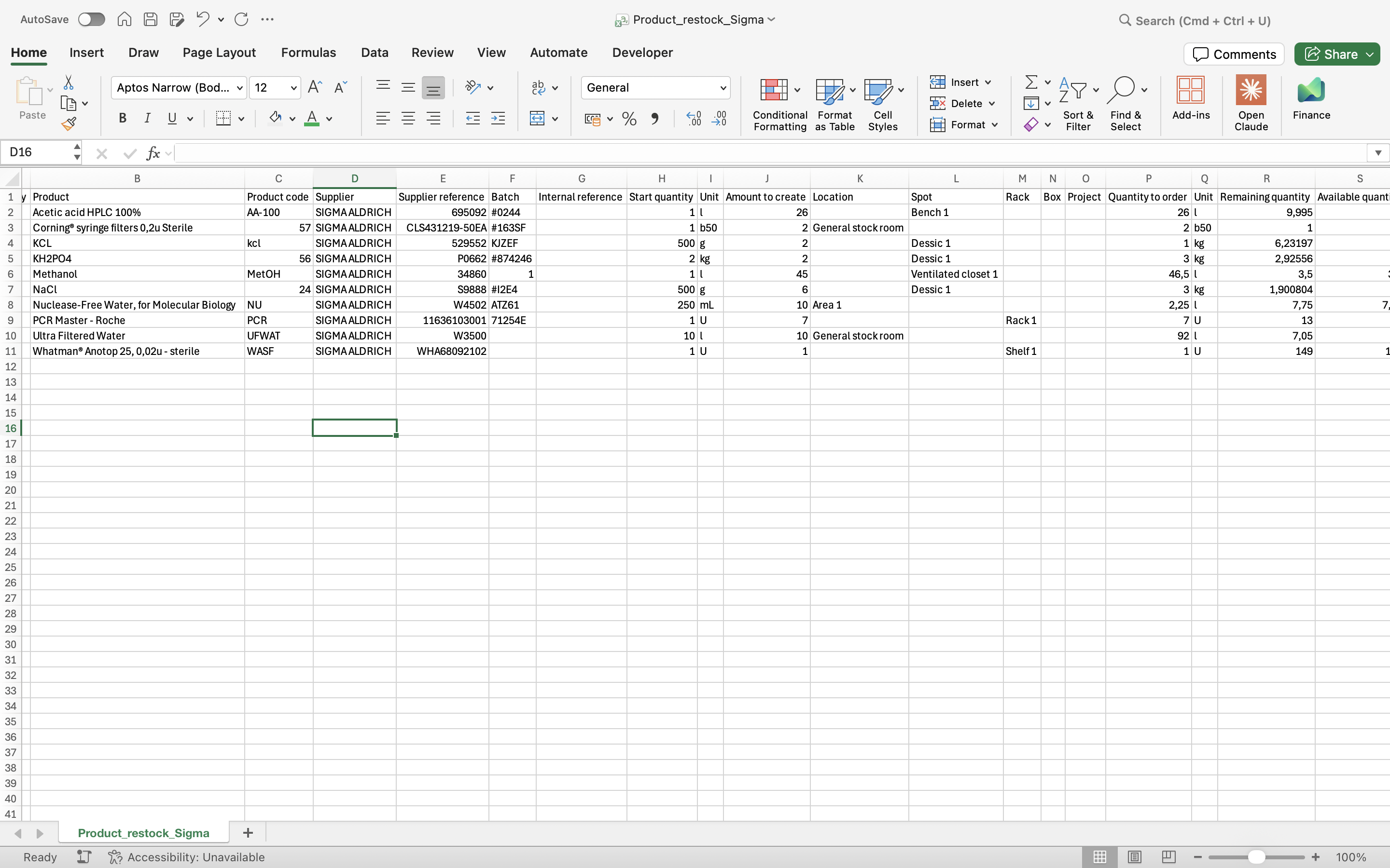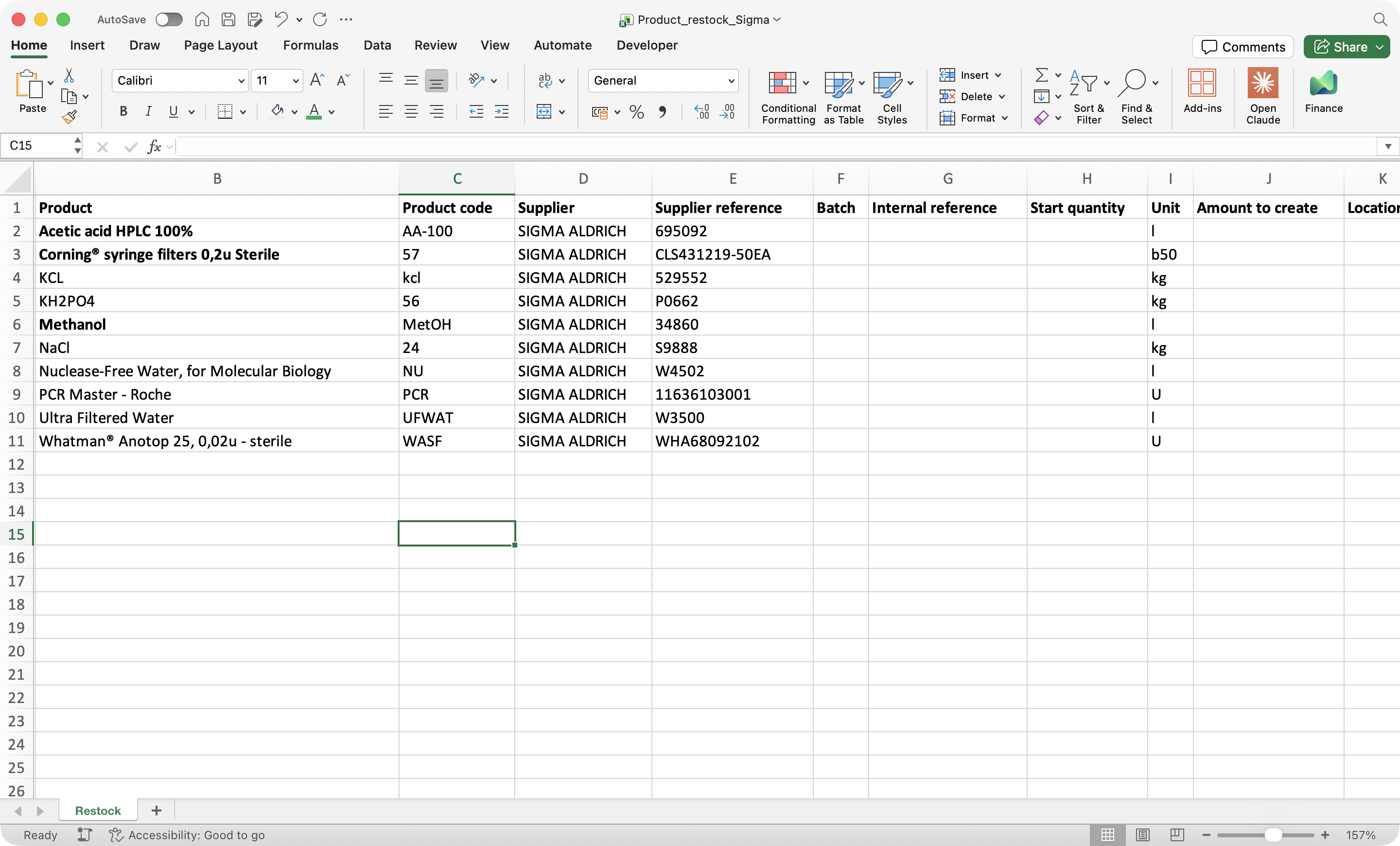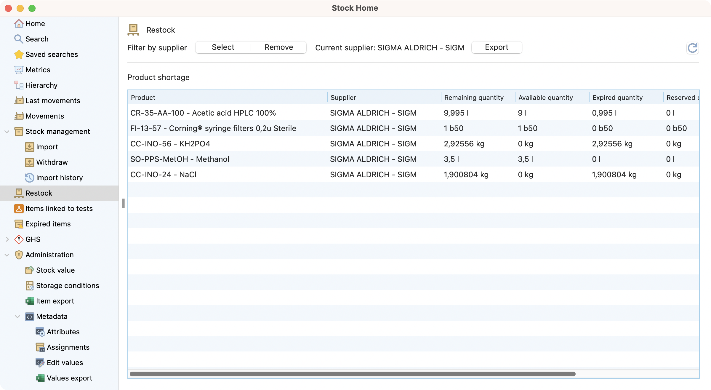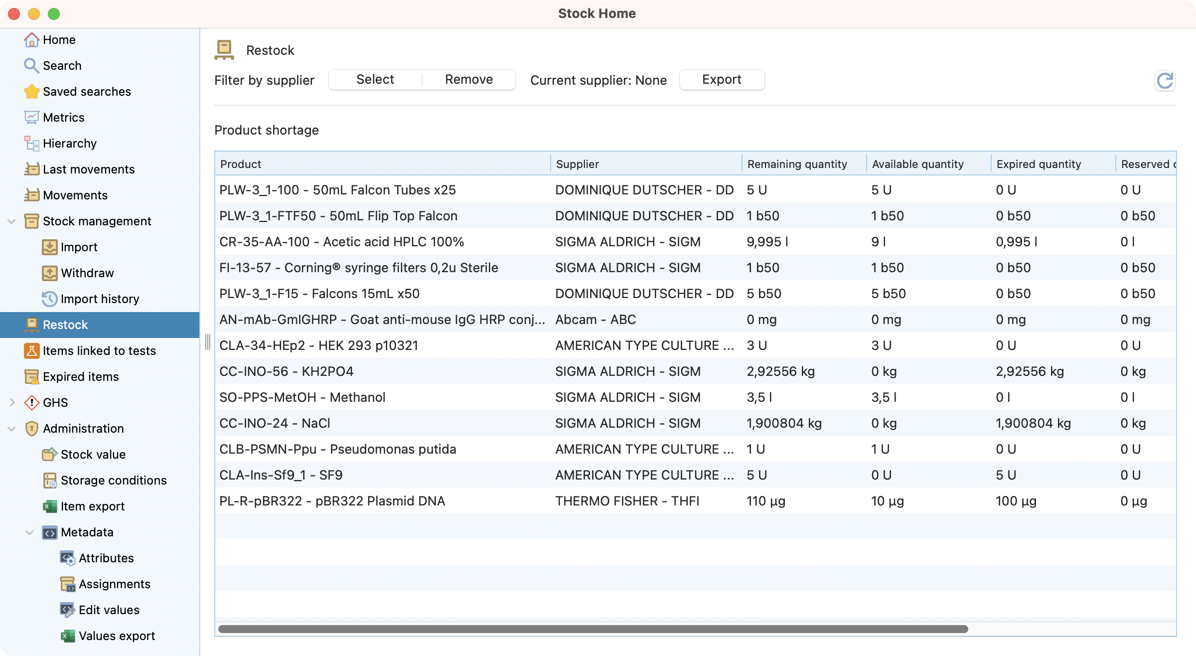 View of the restock list after selecting a supplier.¶