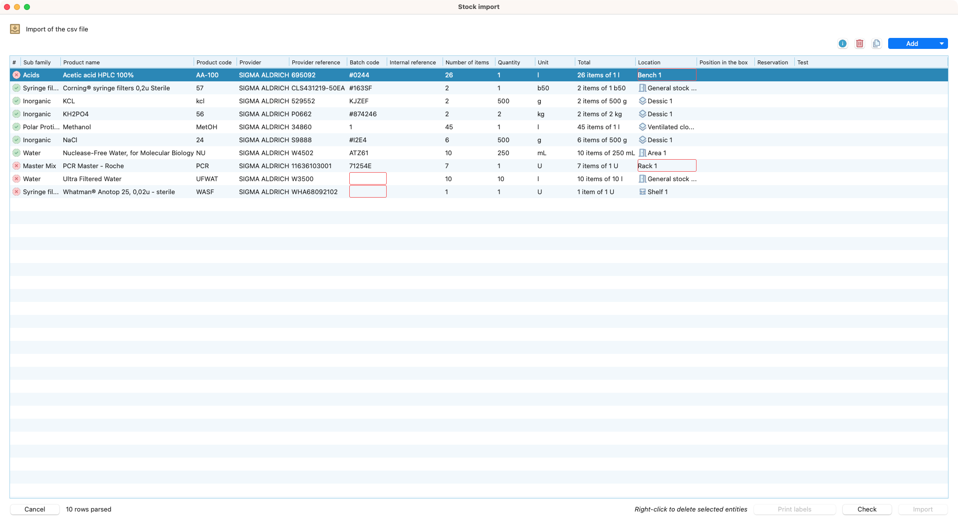 Import errors highlighted in red for correction.¶